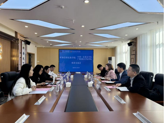為順利推進(jìn)研究生招生與培養(yǎng)等工作,切實(shí)加強(qiáng)與兄弟民族院校的交流與合作,我院院長(zhǎng)胡春香、副院長(zhǎng)白木仁、朝克圖教授及王海峰副教授一行4人于2025年11月27日赴廣西民族大學(xué)法學(xué)院進(jìn)行調(diào)研,廣西民族大學(xué)法學(xué)院黨委書記蔣慧,中國——東盟法學(xué)院執(zhí)行院長(zhǎng)、廣西民族大學(xué)法學(xué)院院長(zhǎng)陳星表示熱烈歡迎。座談會(huì)上,蔣慧表示雙方具有很多相似的辦學(xué)條件和發(fā)展目標(biāo),交流契合點(diǎn)多,都堅(jiān)持以高質(zhì)量法學(xué)教育服務(wù)地方法治建設(shè),期待以此為基礎(chǔ),進(jìn)一步強(qiáng)化區(qū)域協(xié)同與合作交流。