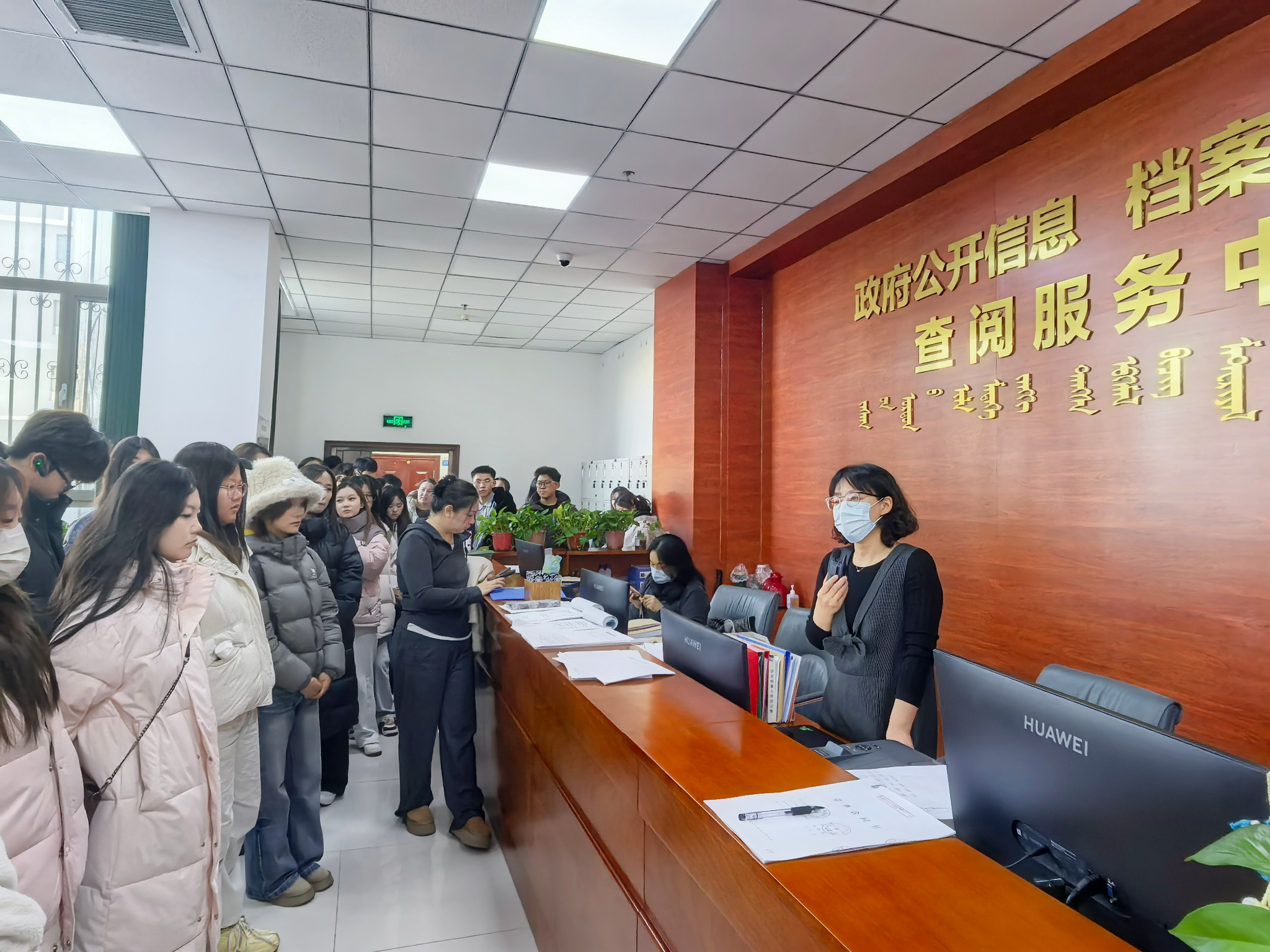 為深化檔案學(xué)專業(yè)新生對(duì)檔案學(xué)科的認(rèn)知,激發(fā)專業(yè)學(xué)習(xí)興趣,2025年11月27日下午,在學(xué)院黨總支副書記阿力坦斯那嘎的帶領(lǐng)下,學(xué)院檔案學(xué)專業(yè)75名學(xué)生赴內(nèi)蒙古自治區(qū)檔案館開展了一次內(nèi)容豐富、意義深遠(yuǎn)的研學(xué)實(shí)踐活動(dòng),上了一堂生動(dòng)的“專業(yè)入門第一課”。