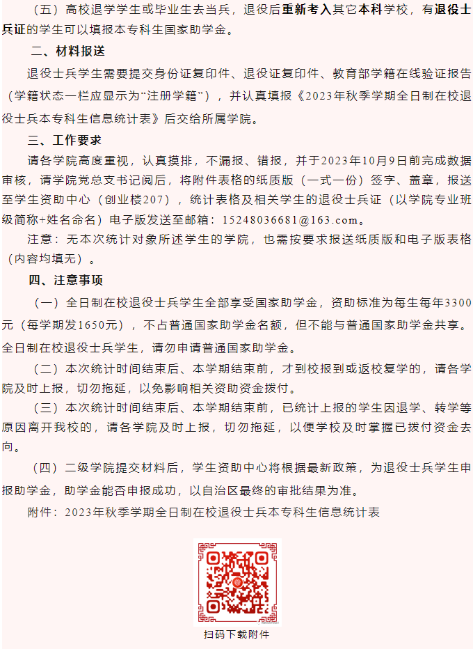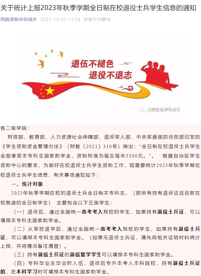 轉載學校黨委學生工作部(處)《關于統計上報2023年秋季學期全日制在校退役士兵學生信息的通知》