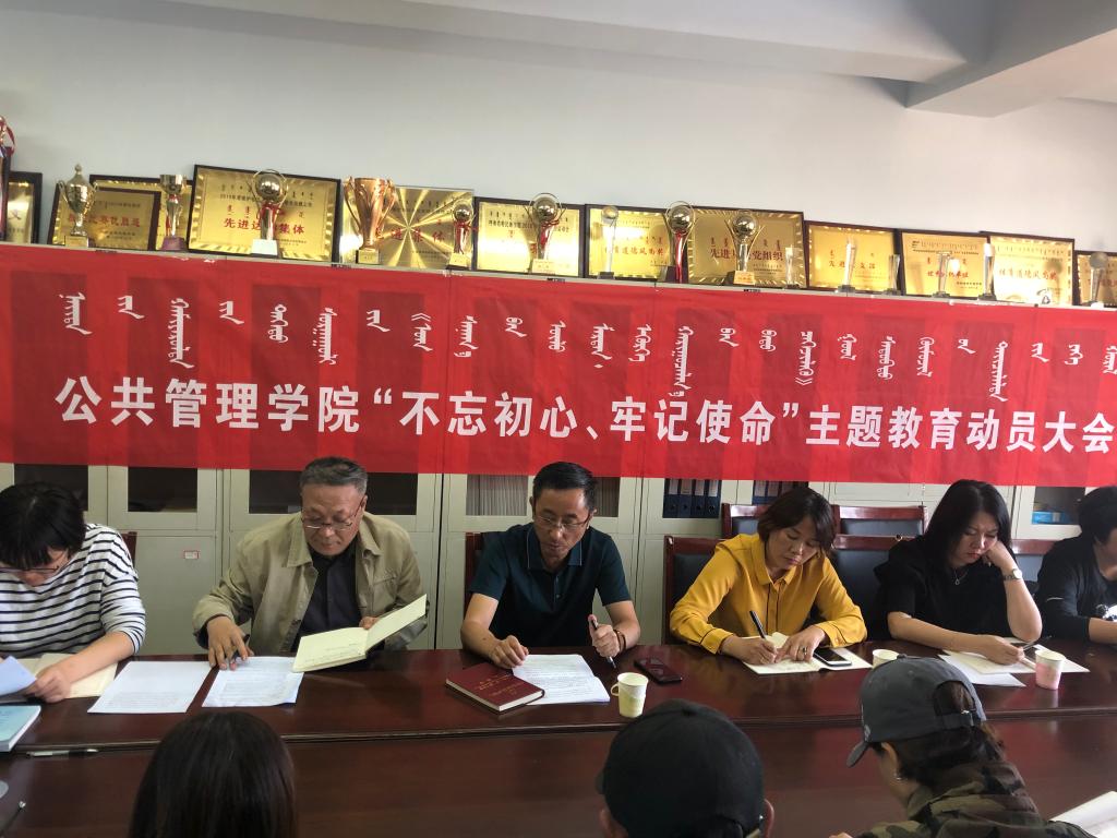 首先由黨總支副書記額爾敦格日樂老師傳達了公共管理學院開展“不忘初心、牢記使命”主題教育活動相關方案,同時對主題教育的開展進行部署動員講話。