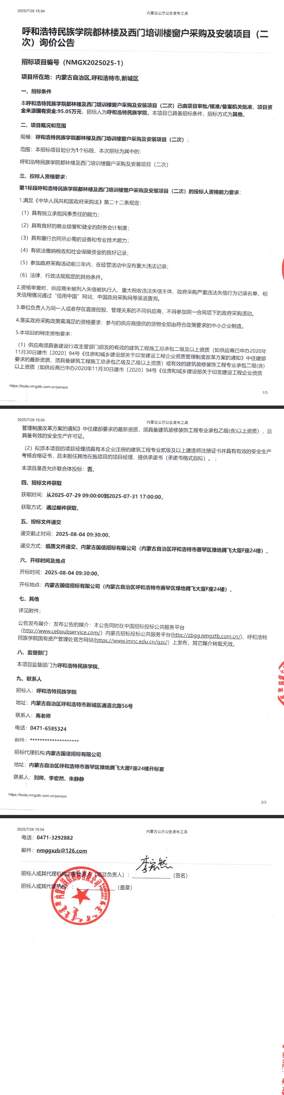 呼和浩特民族學院都林樓及西門培訓樓窗戶采購及安裝項目(二次)詢價公告