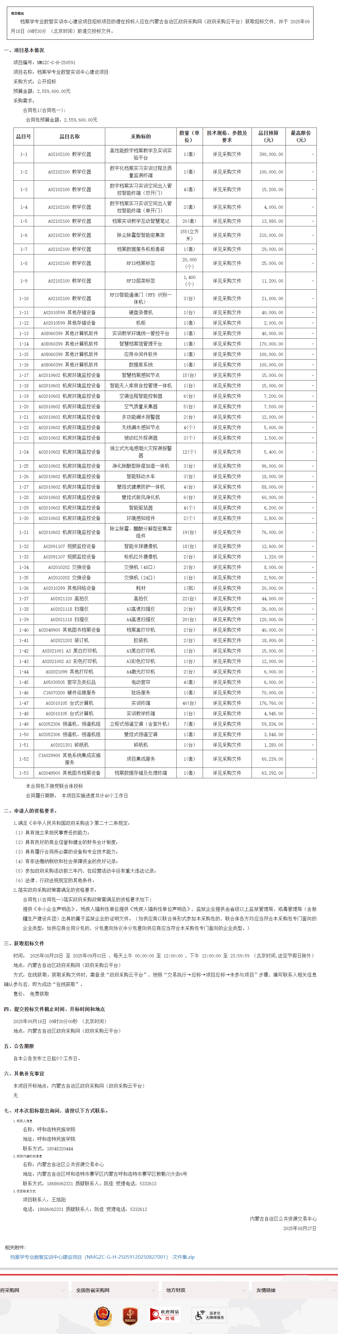 呼和浩特民族學院檔案學專業數智實訓中心建設項目招標公告