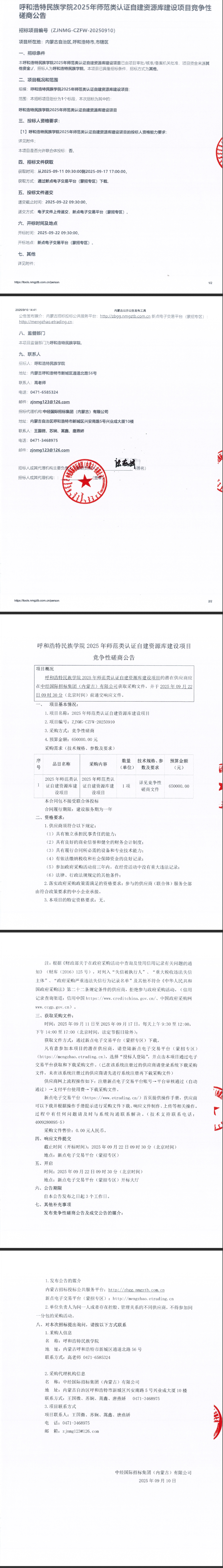 呼和浩特民族學(xué)院2025年師范類認(rèn)證自建資源庫建設(shè)項目競爭性磋商公告