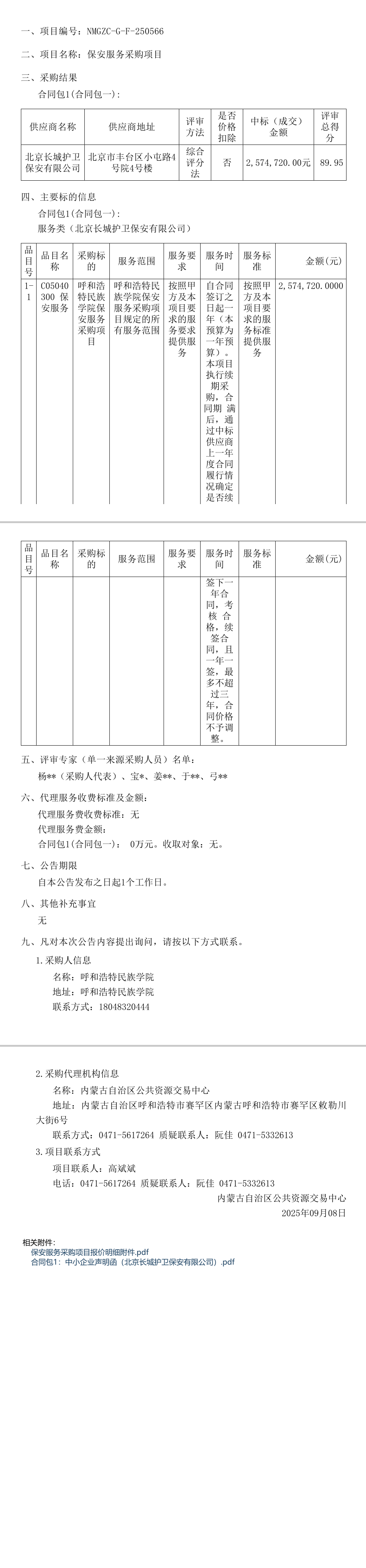呼和浩特民族學(xué)院保安服務(wù)采購項目中標(成交)結(jié)果公告