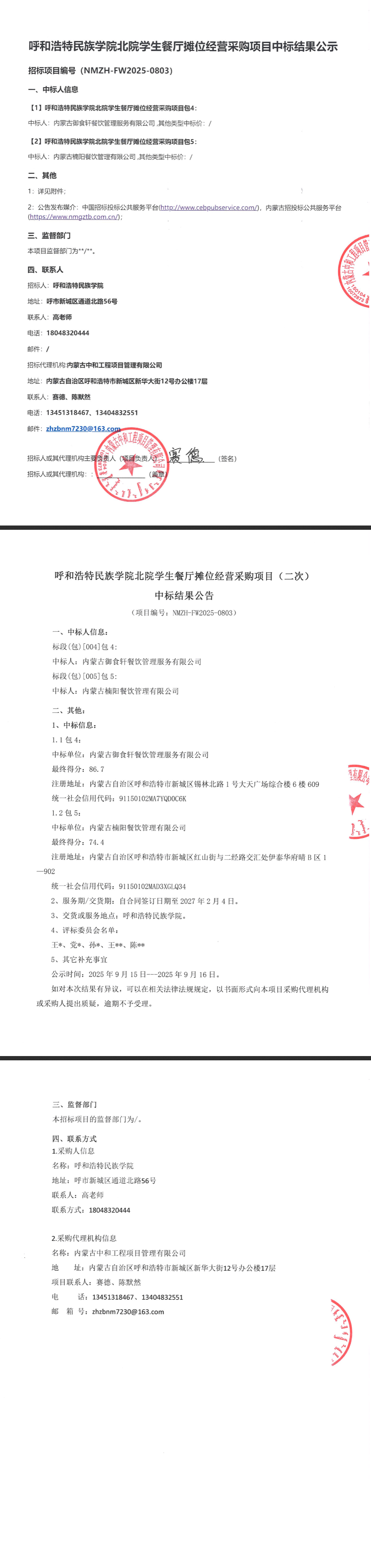 呼和浩特民族學院北院學生餐廳攤位經營采購項目中標結果公示