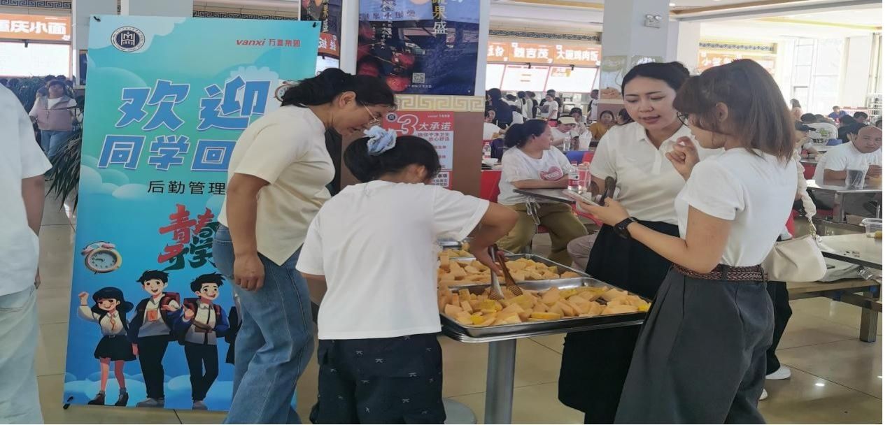 伙食科在食堂為遠道而來、旅途奔波的新生和家長免費提供愛心水果,水果傳遞著關懷,甜在嘴里,暖在心間。