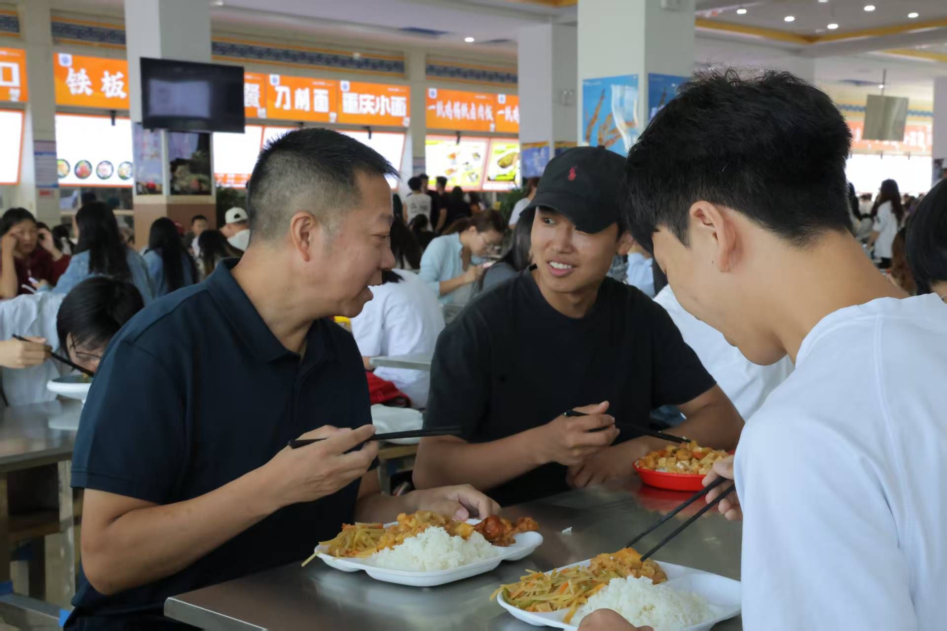 食堂內(nèi)飯菜飄香,校領(lǐng)導(dǎo)與學(xué)生一同排隊選餐,耐心詢問飯菜口味、分量、環(huán)境及服務(wù)水平,并就課程學(xué)習(xí)、校園生活等方面深入交流,認真聽取大家的意見建議。同學(xué)們也積極分享校園生活與學(xué)習(xí)心得,現(xiàn)場氛圍輕松愉悅。