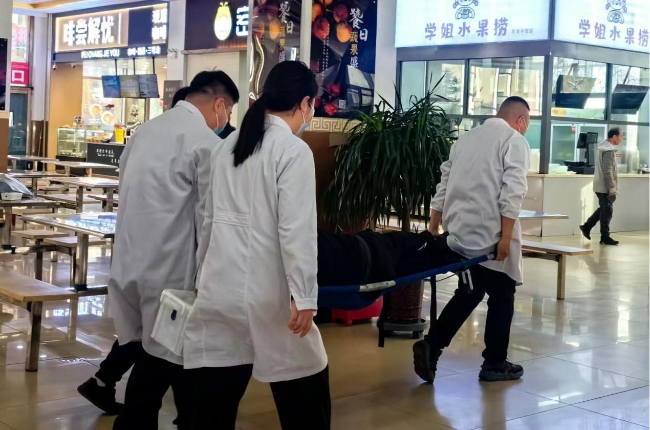 演練啟動后,食堂安全管理員第一時間停售涉事食品并按流程上報,同時引導疑似不適學生至臨時觀察區。校醫務所人員迅速抵達現場,完成對患者的問詢、癥狀記錄及初步醫療處置,隨后使用擔架將其轉運至定點醫院。同步,食堂對涉事窗口實施封鎖管控,設置警戒區域,并立即啟動同批次就餐人員追蹤溯源工作,對涉事食品樣本進行規范封存。整場演練歷時30分鐘,各環節銜接順暢,響應迅速,有效驗證了應急預案的可行性與時效性。