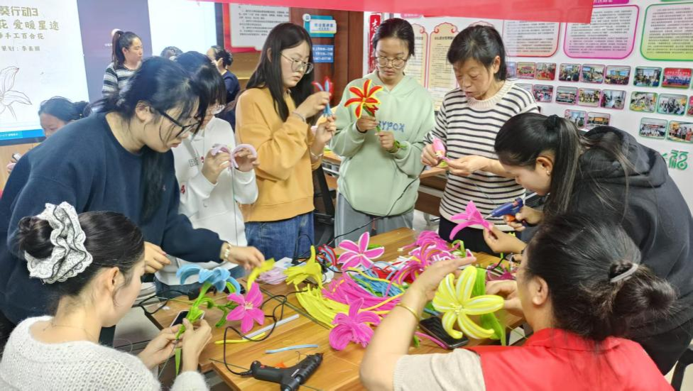 活動中,志愿者們與“星星的孩子”及家長們一同參與了“指尖生花,愛暖星途”扭扭棒手工百合花制作。志愿者們耐心指導,與孩子們一起動手,用彩色扭扭棒制作出一朵朵精致的百合花。現場氣氛溫馨融洽,孩子們在手工創作中收獲了快樂與自信,家長們也感受到了來自青年志愿者的關愛與支持。