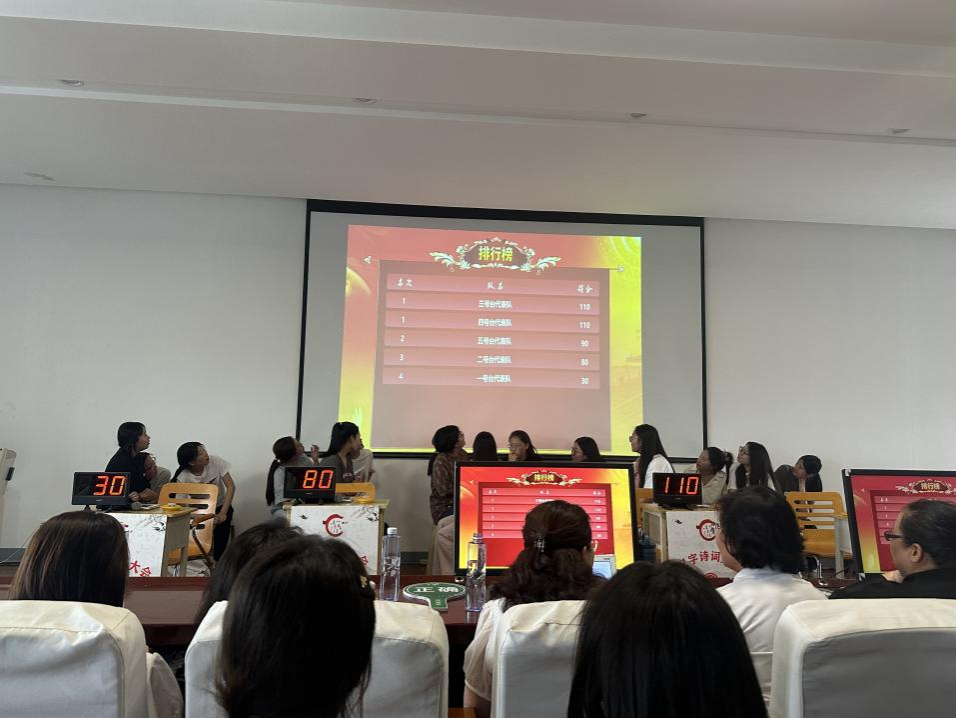 比賽分為四個環節,選手們通過“小試牛刀”“點字成詩”等環節展現了扎實的漢字功底,贏得了觀眾陣陣掌聲?!把奂彩挚臁杯h節更是考驗了選手們的快速反應和書寫能力,現場氣氛緊張而激烈。比賽間隙,烏雅汗同學為大家獻上了悠揚的歌曲,有效緩解了現場緊張的氛圍,為大家帶來了一絲輕松與愉悅。