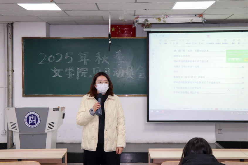 會上,高娃院長說明見習注意事項,強調見習期間的安全與學習要求。叮囑同學們在見習中既要保持謙遜好學的態度汲取實踐經驗,也要時刻維護文學院學子的良好精神風貌,以嚴謹務實的姿態應對各項見習任務。張暘老師詳細解讀見習手冊填寫注意事項,明確相關流程與標準。確保同學們能規范、完整地呈現見習成果,為后續見習工作的有序開展奠定了基礎。