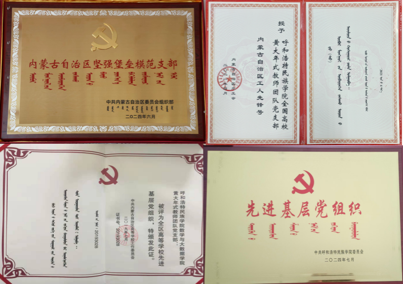 黃大年式教師團隊黨支部2019年被教育部列為第二批新時代高校黨建“雙創”工作“全國黨建工作樣板支部”,同年被中共內蒙古自治區高等學校工作委員會評為全區高等學校先進基層黨組織。2021年被中共內蒙古自治區高等學校工作委員會列為“最強黨支部”建設單位。2021年4月榮獲內蒙古自治區“工人先鋒號”稱號,2022年4月榮獲全國“工人先鋒號”稱號。2024年,獲評“內蒙古自治區堅強堡壘模范支部”,入選全國高校“雙帶頭人”教師黨支部書記“強國行”專項行動團隊。黨支部1人被內蒙古自治區黨委授予“擔當作為好干部”,6人先后被學校黨委評為優秀黨務工作者、優秀共產黨員。2024年數學與大數據學院黨總支獲評內蒙古自治區高校黨建標桿院系,并被學校黨委評為先進基層黨組織。