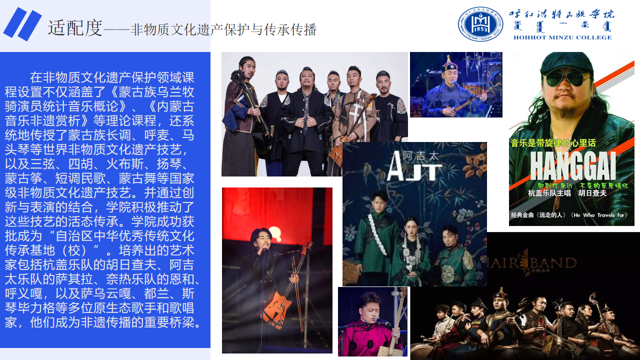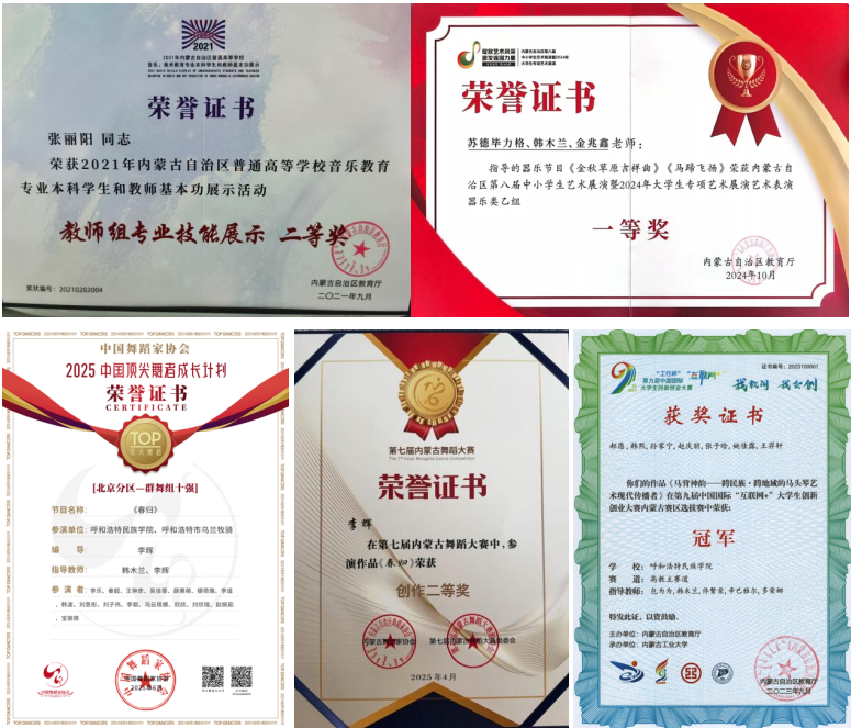 學院立足內蒙古、面向基層,設音樂表演、音樂學(教育方向)、舞蹈學專業。緊扣國家與區域發展需求,服務鄉村振興,構建教學—科研—傳承—創作—表演一體化課程體系,培養專業素養深厚、實踐能力突出的音樂舞蹈人才。推進一流專業建設:音樂學專業校級一流,三門校級一流課程,兩門自治區級一流課程;馬頭琴教學獲批中華優秀傳統文化傳承基地。創新創業項目《馬背神韻》獲互聯網+大賽區賽冠軍、全國金獎,彰顯教育成果,已孵化公司創收盈利并帶動就業。