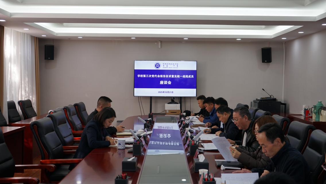 為高質量籌備中國共產黨呼和浩特民族學院第三次黨員代表大會,充分發揚民主,廣泛聽取意見,近期,學校黨委面向無黨派人士代表、民主黨派代表、留學歸國人員代表,離退休老干部老同志代表,學生代表,高層次人才代表,基層黨組織負責人等群體,組織召開5次專題座談會,充分聽取各類代表對黨代會工作報告的意見建議。