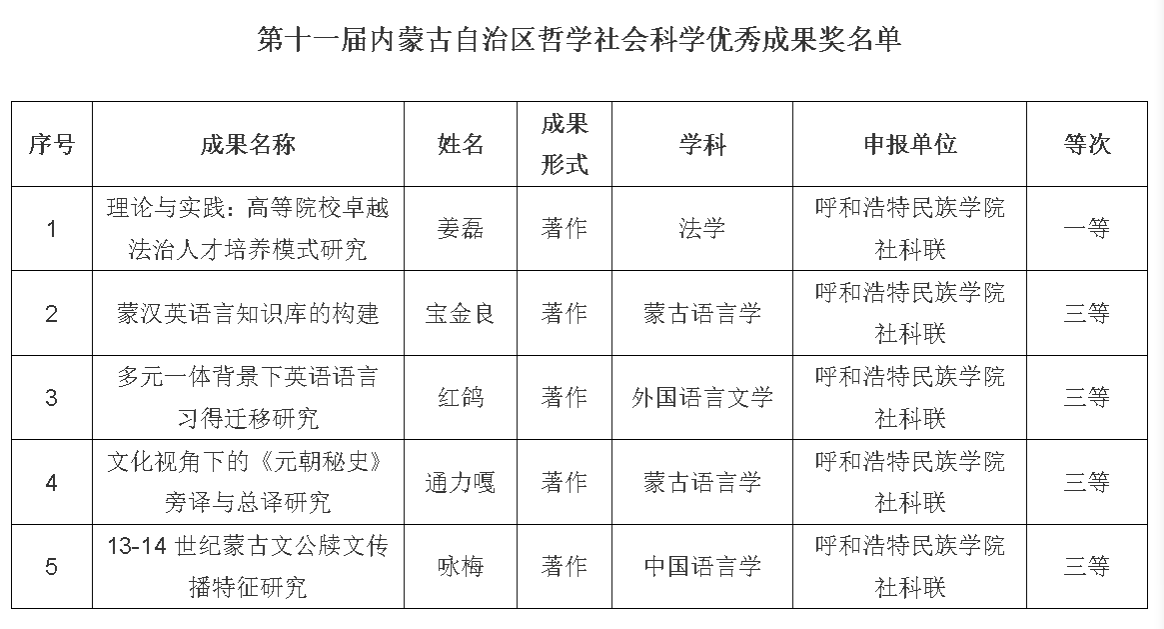 近日,內(nèi)蒙古自治區(qū)社會(huì)科學(xué)界聯(lián)合會(huì)發(fā)布《關(guān)于第十一屆內(nèi)蒙古自治區(qū)哲學(xué)社會(huì)科學(xué)獎(jiǎng)評選結(jié)果的公示》,我校5項(xiàng)成果在本次評選中獲獎(jiǎng),其中一等獎(jiǎng)1項(xiàng)、三等獎(jiǎng)4項(xiàng),實(shí)現(xiàn)了新的突破。