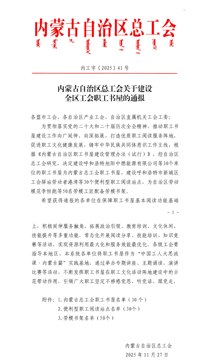 近日,內(nèi)蒙古自治區(qū)總工會(huì)印發(fā)《關(guān)于建設(shè)全區(qū)工會(huì)職工書(shū)屋的通報(bào)》(內(nèi)工字〔2025〕41號(hào)),我校成功入選“內(nèi)蒙古總工會(huì)職工書(shū)屋”建設(shè)單位,同時(shí)被納入“便利型職工閱讀站點(diǎn)”建設(shè)名單。