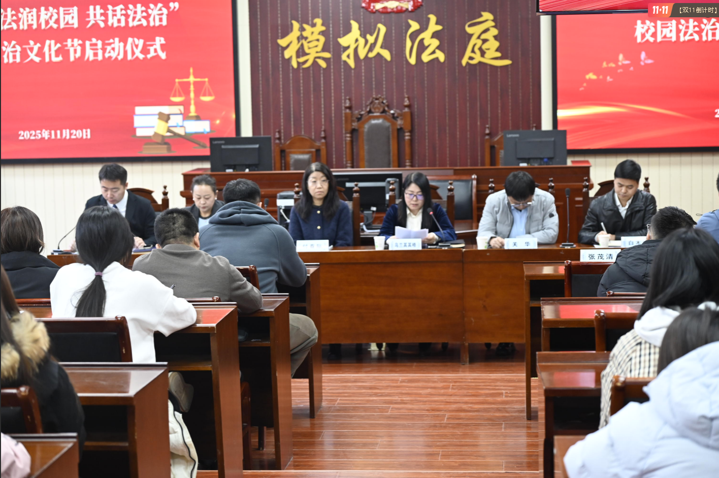 11月20日,法治文化節在都林樓一樓116模擬法庭正式拉開序幕。呼和浩特市法律援助中心主任付春際、新城區司法局局長關華等嘉賓與法學院全體教師及學生代表齊聚一堂,共同參加活動。活動現場,大家集體觀看了反詐宣傳片。法學院黨總支書記烏蘭其其格作了致辭,宣讀實施方案,明確了模擬法庭、法律辯論賽、法治講座等多項活動安排,并提出師生共同營造“學法、懂法、守法、用法”的良好氛圍的倡議。啟動儀式后,與會人員圍繞校地協同育人、實踐教學創新等議題開展專題研討,凝聚育人共識。