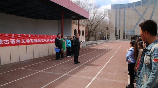 為全面加強學風建設,營造和諧文明的宿舍文化氛圍,2015年4月9日,蒙古語言文學系宿舍文化節啟動儀式在學院操場成功舉行。學生處公寓管理中心主任白龍、蒙古語言文學系領導班子、輔導員、班主任以及500多名學生參加了本次活動。儀式由黨總支副書記白東升主持。