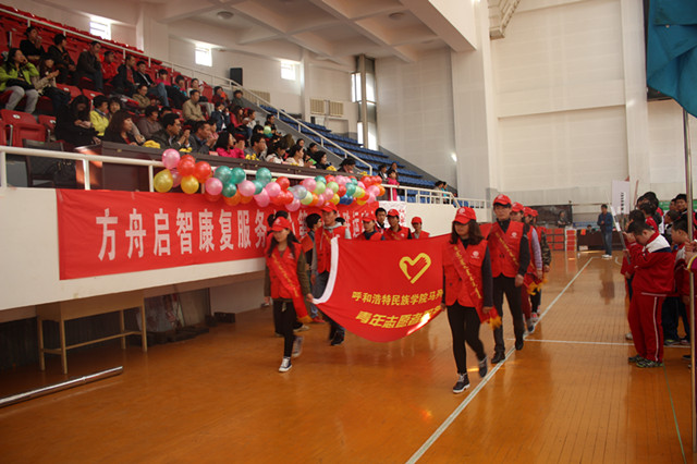 ??12日上午9點整,呼和浩特民族學院馬列教研部組成的志愿者團隊在運動會主席臺前走過并宣誓。活動中,志愿者們不忘11日的培訓,仔細認真地引領著這些特殊的孩子們有序的參與各項目的比賽。最終,在我部以及其他學校社會工作者和社會愛心人士的鼓勵下,方舟啟智特殊教育學校首屆特奧會取得圓滿成功。