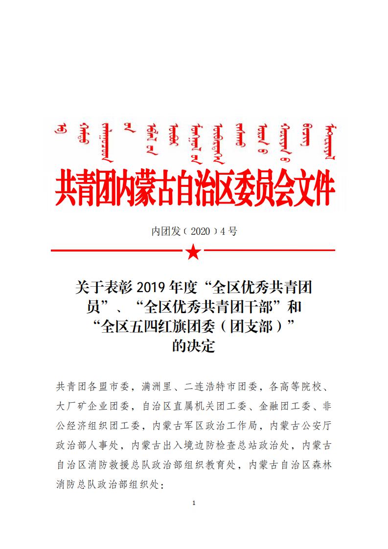 近日,共青團內蒙古自治區委員會下發了“關于表彰2019年度“全區優秀共青團員”、“全區優秀共青團干部”和“全區五四紅旗團委(團支部)”的決定(內團發[2020]4號),我校團委榮獲“全區五四紅旗團委”榮譽稱號。