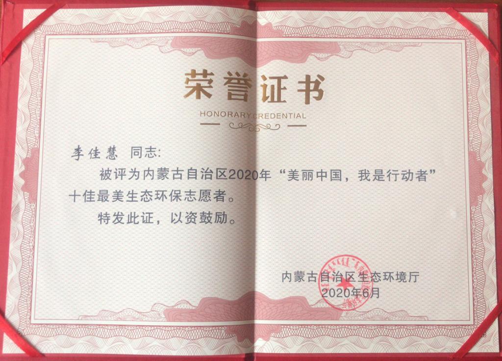 為深入宣傳貫徹習近平總書記對內蒙古工作重要講話精神,提高公眾生態環保意識,凝聚加強生態環境保護全社會共識,內蒙古自治區生態環境廳與中國郵政集團公司內蒙古自治區分公司于6月5日聯合舉辦2020年內蒙古自治區紀念六五環境日暨環郵戰略合作簽約儀式,表彰全區“十佳最美環保志愿者”,我校環境保護志愿者協會李佳慧同學榮獲2020年“美麗中國,我是行動者”十佳最美生態環保志愿者榮譽稱號。